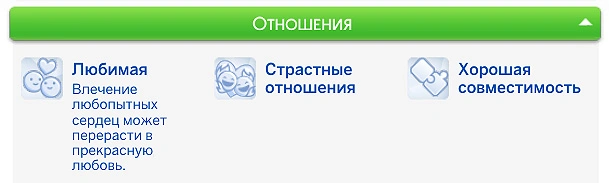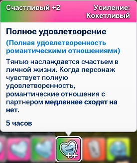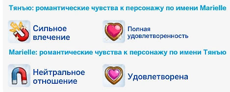 - Полная удовлетворённость — персонажа всё устраивает в отношениях: он будет получать мудлет на +2 счастья, а уровень его романтических отношений будет расти сам по себе;