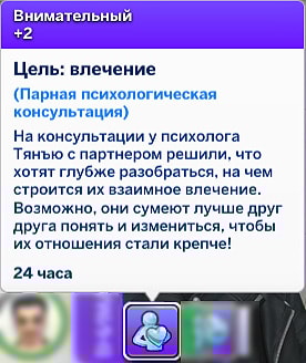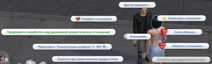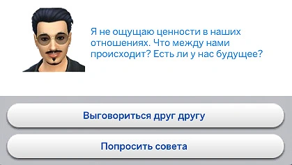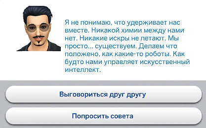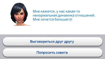 После этого появится ещё один всплывающий диалог. При выборе варианта "Выговориться друг другу" персонажи выстроят конструктивный диалог, в ходе которого выработают новую случайную динамику отношений. Вариант "Попросить совета" расскажет вам о динамике романтических отношений и о том, как изменить направление отношений.