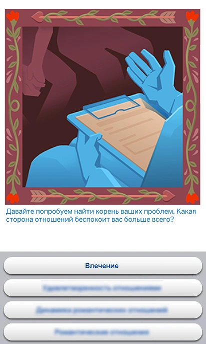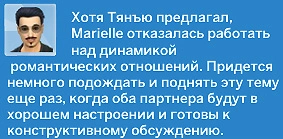 После этого появится диалог с претензией со стороны одного из персонажей. При выборе варианта "Выговориться друг другу" персонажи выстроят конструктивный диалог, в ходе которого узнают друг о друге неизвестные ранее факты, а также лучше поймут свои предпочтения. Вариант "Попросить совета" расскажет вам о системе влечения и о том, как узнавать о том, что вас привлекает и отталкивает.