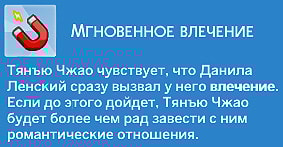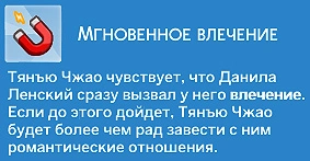 Влечение — это привлекательность персонажей друг для друга на основе внешних и внутренних качеств. В зависимости от уровня привлекательности влечение бывает разного уровня: