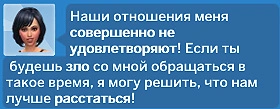 После этого появится новое окно, где персонажи будут обсуждать проблему своих отношений. При выборе варианта "Выговориться друг другу" персонажи выстроят конструктивный диалог, в ходе которого получат значительное улучшение удовлетворённости отношениями. Вариант "Попросить совета" расскажет вам про удовлетворённость отношениями и о том, как улучшить их и не уменьшать.