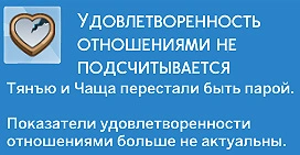 Если персонажи расстаются или долго не видят друг друга и не поддерживают романтические отношения, удовлетворённость перестанет учитываться для них.