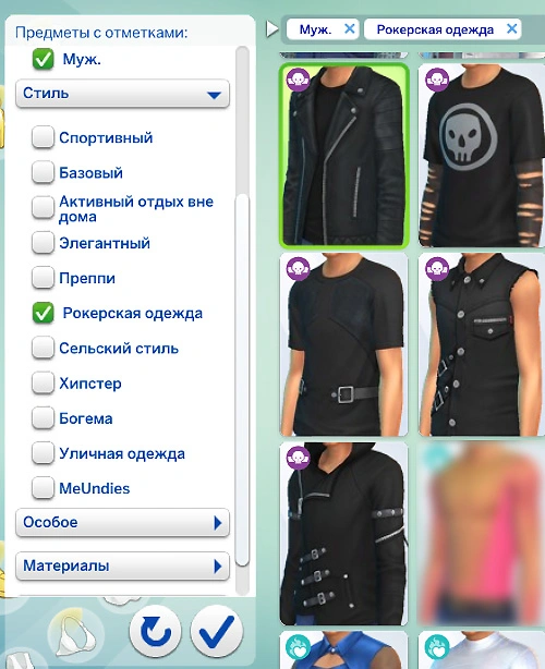 Чтобы выбрать одежду стиля, который нравится вашему партнёру, нажмите на стрелочку слева возле категорий одежды, выберите выпадающий список "Стиль" и отметьте в квадратиках те стили одежды, которые по душе вашему партнёру!