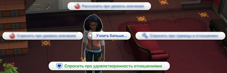 Как можно заметить, информация об уровне удовлетворённости отношениями не всегда совпадает для двух персонажей. Если вам неизвестно мнение со стороны партнёра, самое время это исправить! Кликайте на партнёра, переходите в категорию "Отношения", раздел "Узнать больше" и выберите действие "Спросить про удовлетворённость отношениями".