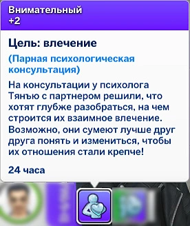 В конце приёма вам будет предложено поставить новую цель на неделю. Выберите вариант "Повысить взаимное влечение", чтобы персонажи получили внимательный мудлет (+2) на сутки!