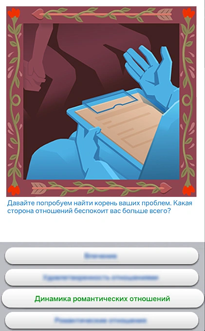 Ещё одним способом является поход на терапию для пар у консультанта по отношениям. Для этого предложите "Консультацию купидона" партнёру в категории "Отношения" или выберите действие "Обратиться в "Консультации купидона" с..." и выберите подходящего партнёра. После начала текстового диалога на вопрос "Какая сторона отношений беспокоит вас больше всего?" выберите вариант "Динамика романтических отношений".