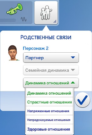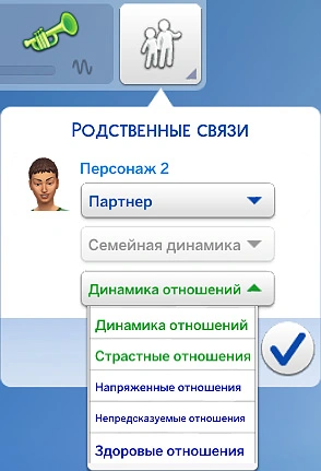 Если вы создаёте семью в редакторе создания персонажа, вы можете создать двух партнёров, указать между ними любые романтические отношения (например, партнёр, невеста/жених или супруга/супруг) и ниже выбрать динамику отношений.
