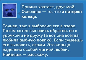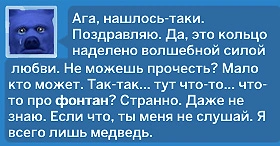 Откройте багаж персонажа, который занимался ловлей, и найдите там кольцо, нажмите на него. Персонаж обнаружит странную надпись, о которой нужно спросить медведя-кольценосца.