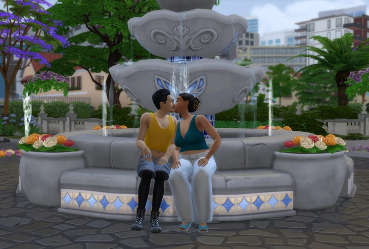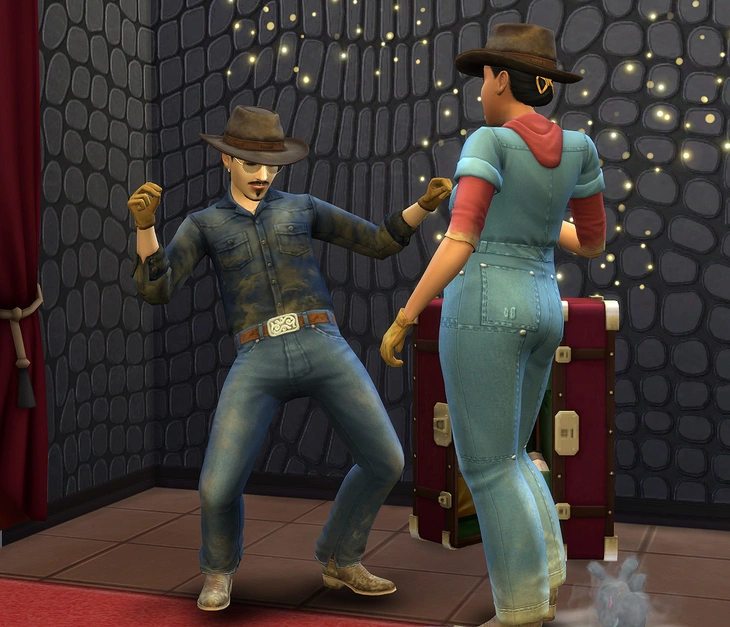 Если на участке, где у вас проходит встреча с партнёром, есть сундук с костюмами, то вы можете перейти в категорию романтических взаимодействий, раздел "Флирт" и выбрать любое из действий "Попросить надеть парные костюмы" или "Попросить надеть кокетливый костюм".