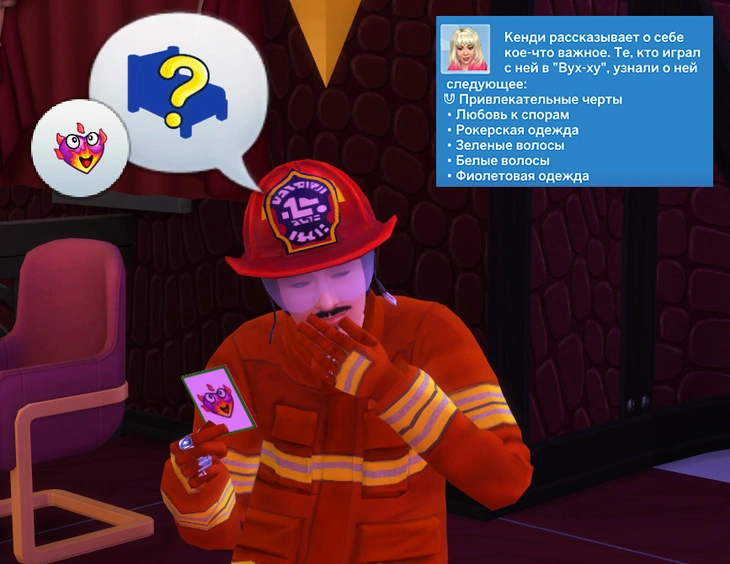 В "Вух-ху!" персонажи вытягивают карточки и задают вопрос о каких-либо предпочтениях, а остальные игроки отвечают на него. Отличный способ присмотреться к потенциальному партнёру!