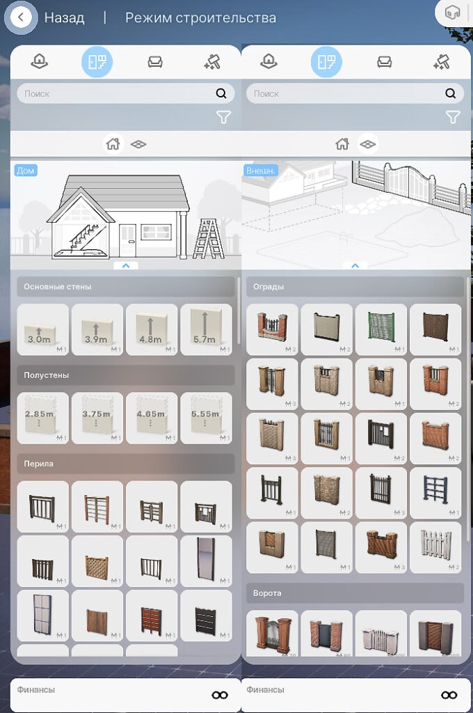 Помимо стен, платформ, крыш и лестниц для создания основных элементов здания, игроки найдут там двери, окна, колонны, перегородки и многое другое. Навигация представлена в виде домика, что интуитивно понятно для игрока. Также можно переключиться на кнопку "Внешн.", чтобы разместить ограду с воротами.