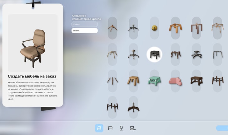 Второй инструмент — это создание объектов из составных частей. Таким образом вы можете собрать столы, стулья, светильники и компьютеры. Для них вы можете выбрать составные части, однако выбор пока несколько ограниченный.