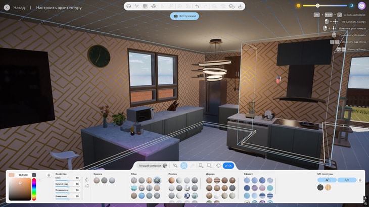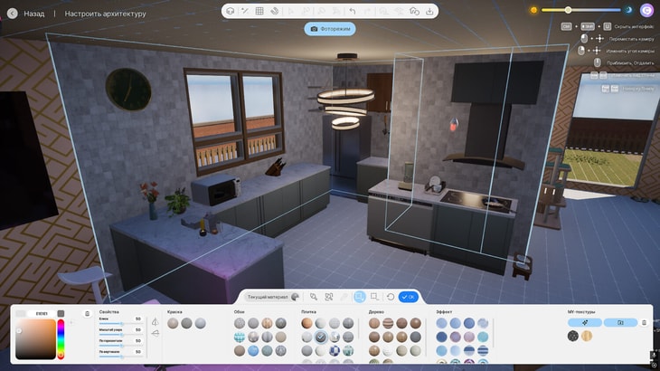 Режим редактирования цвета и материала позволяет тонко настроить практически любой элемент дома под свои нужды. Он напоминает редактор создания стиля из The Sims 3, поскольку имеет цветовой спектр, на котором есть возможность выбрать любой цвет и даже сохранить его на палитру. Также есть возможность выбрать материал, который будет покрывать объект. Для каждого объекта набор материалов свой, и менять его нельзя. У текстуры можно выбрать блеск, масштаб узора и сместить симметрию, с которой он отображается.