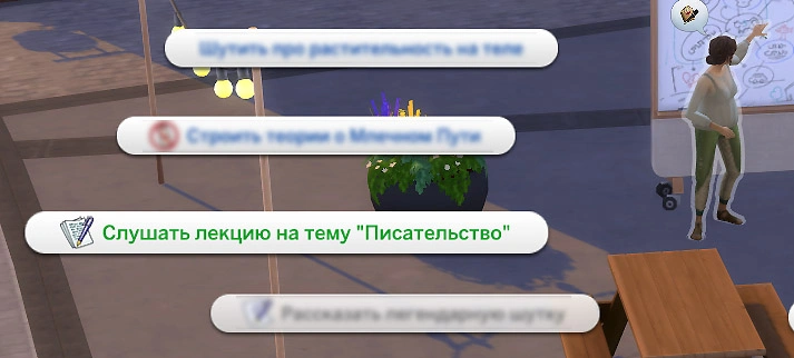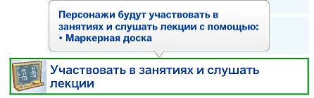 Вы можете сами провести лекцию у маркерной доски! Для этого нажмите на маркерную доску и выберите действие "Провести лекцию..." или "Провести лекцию для..." и выберите конкретных персонажей, которых хотите обучать!