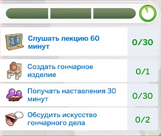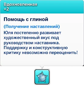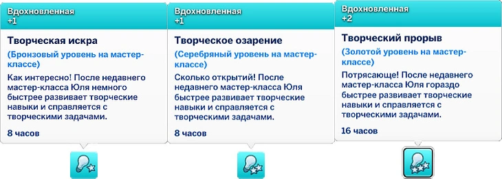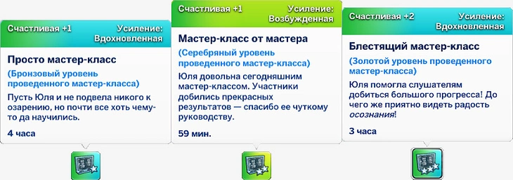 За участие в мастер-классе в качестве ученика ваш персонаж получит мудлет, который позволит ему изучать навыки быстрее! Мудлет может ускорять творческие, интеллектуальные, социальные или активные задачи в зависимости от темы посещённого мастер-класса!