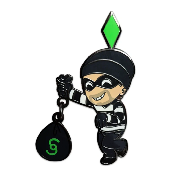 Внимание всем нашим пятипальцевым симам со скидкой: вор уже здесь! К счастью, просто как коллекционный значок, поэтому ваши драгоценности в безопасности! Этот новый значок размером 2 дюйма (примерно 5,1 см) сделан из высококачественной блестящей эмали и демонстрирует вора, одетого в самый подлый костюм, в то время как он несёт мешок с деньгами, который присоединён цепочкой, так что он будет двигаться, когда вы будете ходить с ним! Этот значок идеален в качестве декорации на пробковой доске или же на вашей сумке, рюкзаке, куртке или где только ваша душа пожелает. Эти значки наверняка привлекут внимание прохожих, давая им понять, кто положил глаз на их сокровища!