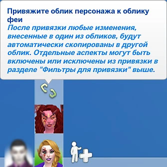 Ваша фея может целиком повторять обычный облик вашего персонажа, а может иметь другой внешний вид, чтобы подчеркнуть волшебную природу. Чтобы разделить внешний вид обликов феи и человека нажмите на клавишу "Привяжите облик персонажа к облику феи" в редакторе создания персонажа. Если всё сделано правильно, то цепи разъединятся, что позволит настраивать облики независимо.