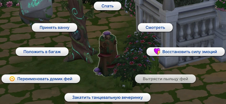 | 5 | (1/2) Повлиять на чувства | Эмоции | Действие на симах "Повлиять на чувства": позволяет вызвать чувство на выбор к фее |