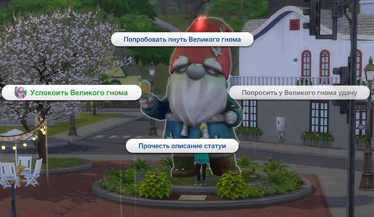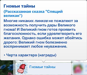 После этого вы получите черту характера, с помощью которой вам откроется действие "Успокоить гнома", предложив ему один из трёх даров. Если вам повезёт, вы получите награду от гнома, но если нет, то он нашлёт на вас заболевание!