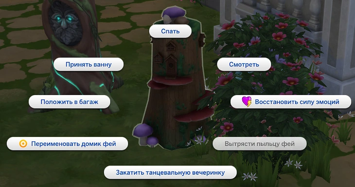 Домик фей — не только уютное место для удовлетворения всех потребностей фей и тусовок, но и отличный способ восстановить свои магические силы! Нажмите на домик и выберите действие "Восстановить силу эмоций".