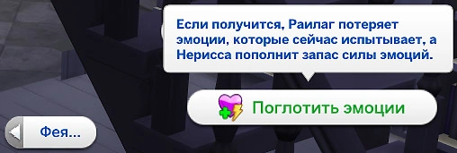 Чтобы восстановить силу эмоций, нажмите на персонажа и выберите действие "Поглотить эмоций" в категории "Фея..."!