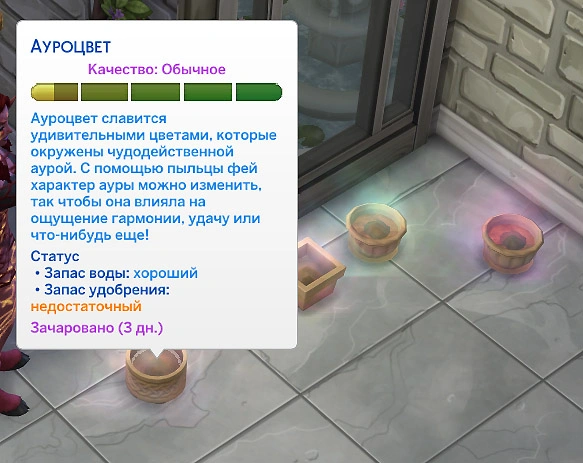 Ауроцвет — новое волшебное растение и знахарский ингредиент, имеющее свойство воздействовать на настроение персонажей. У него всего 7 аур, которые можно поменять с помощью пыльцы фей. Для этого растение не должно быть в ауре мстительности. Нажмите на растение и выберите действие "Изменить характер ауры". Это будет стоить 1 горку пыльцы фей.