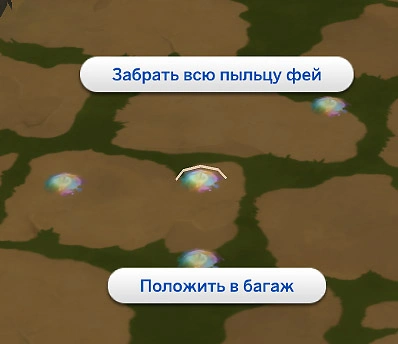 Там, где бывают феи, на земле то и дело появляются горки пыльцы фей. Также она появляется возле них после ухода за своей гигиеной или занятий вуху. Нажмите на горку пыльцы и выберите действие "Забрать всю пыльцу фей"!
