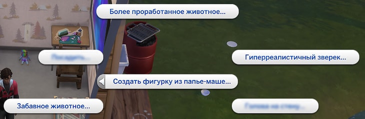 Для создания зверьков из папье-маше вам понадобится набор для поделок из бумаги. Нажмите на него и выберите действие "Создать фигурку из папье-маше", а затем любой из трёх вариантов: "Забавное животное...", "Более проработанное животное...", "Гиперреалистичный зверек...".