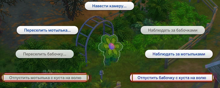 На кусте может жить только один вид бабочек или мотыльков! Чтобы освободить куст, нажмите на действие "Отпустить бабочку с куста на волю" или "Отпустить мотылька с куста на волю".