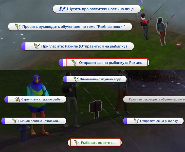 Ловить рыбу можно с кем-то! Для этого нажмите на водоём или знак "Рыбная ловля разрешена" и выберите действие "Рыбачить вместе с..." и выберите желаемого персонажа! Также вы можете присоединиться к уже рыбачащему человеку! Для этого нажмите на персонажа и выберите действие "Пригласить: (Отправиться на рыбалку)".