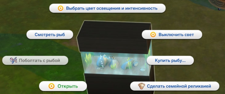 Если у вас маленький аквариум, чтобы поселить туда рыбу, нажмите на аквариум и выберите действие "Добавить рыбу..." и выберите нужный вариант из списка.