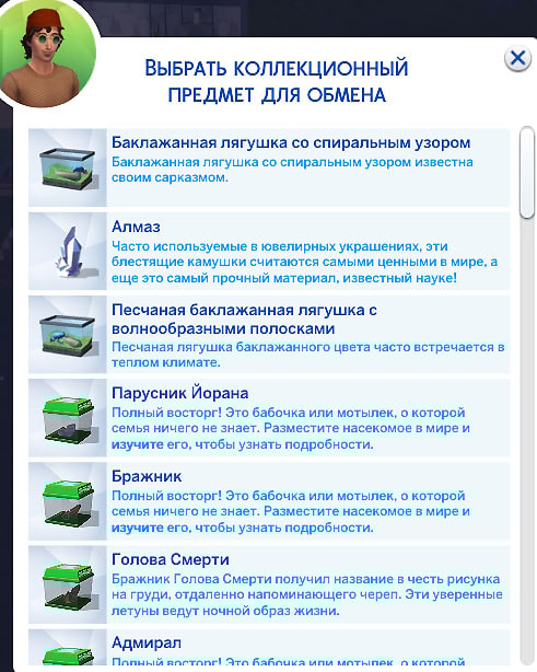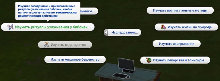 За сбор коллекции ваш персонаж может изучить ритуалы ухаживания у бабочек и применять их в своей романтической жизни. Чтобы их изучить, нажмите на компьютер и выберите действие "Сеть...", "Исследования...", "Изучить ритуалы ухаживания у бабочек".