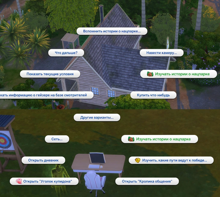 Изучать истории о нацпарке необходимо персонажам, которые работают в нацпарке по специализации "Лесник". Это действие доступно персонажам на работе, на компьютере, а также на базе смотрителей парка "Бабочка" в Занимательных зарослях! Историй действительно много, и это будет интересно тем, кто любит узнавать больше о мирах в The Sims!