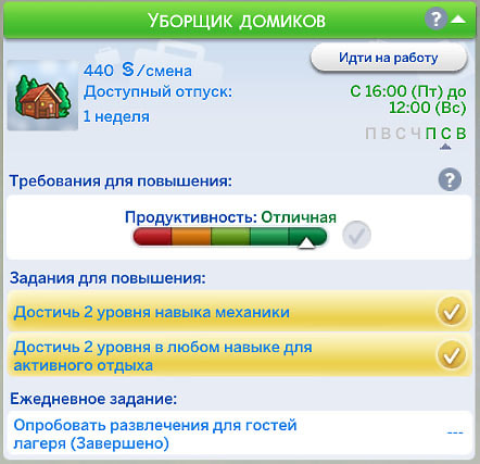 Вам может попасться ежедневное задание "Опробовать развлечения для гостей". Это действие доступно с 8:00 до 22:00 и повышает вашу продуктивность на работе, а также может дать мудлет и ускорение развития случайных навыков, связанных с развлечениями в лагере! Среди них археология, верховая езда, катание на лыжах, катание на сноуборде, рыбная ловля, садоводство, скалолазание, стрельба из лука, траволечение и фитнес. Можно выполнять раз в день.