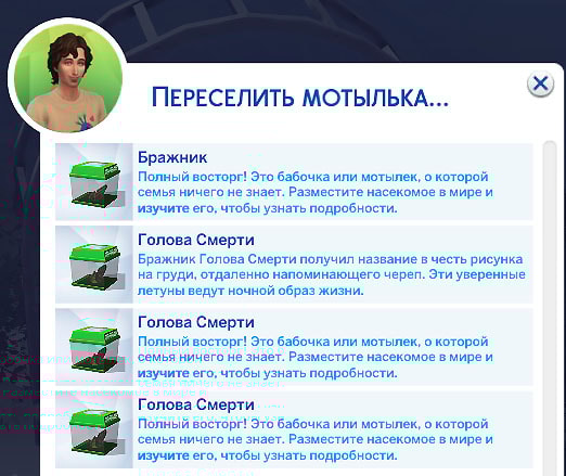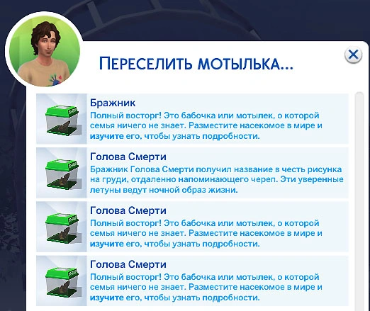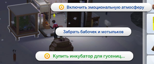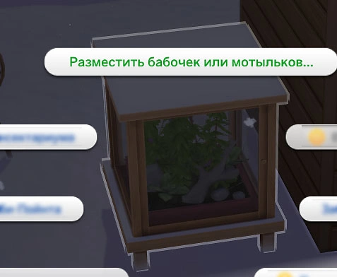 Чтобы поместить бабочек в инсектариум, нажмите на него и выберите действие "Разместить бабочек или мотыльков...".