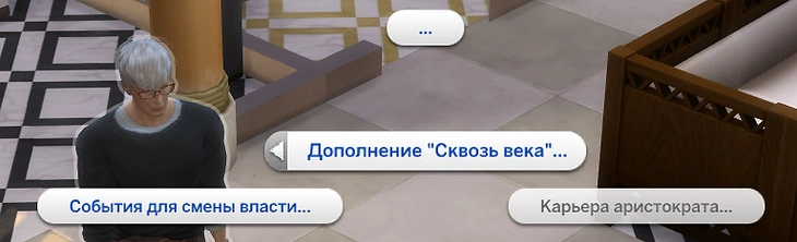 Нажмите на персонажа левой кнопкой мыши, введя код разработчика, с зажатой клавишей Shift. Перейдите во вкладку "Дополнение "Сквозь века"”. Здесь вы увидите четыре опции: “Карьера аристократа” (будет заблокирована, если персонаж не работает аристократом), "Авторитет аристократа" (невидима не аристократам) и “События для смены власти...” и"...".
