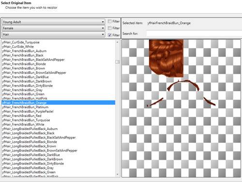 Чтобы перекрасить волосы, нам нужна их текстура. Все прически имеют текстуры для цветов (т. е. для красного цвета волос - одна текстура, для черного - другая). Итак, у нас есть 42 женские прически и у каждой из них 18 цветов (перекрасок) - итого 756 текстур. Вы можете выбрать любую их них. Найти определенный цвет в игре легко, но вот найти прическу, которую вы выбрали и изменили будет не просто. С этим я не могу вам помочь, просто посмотрите на название и поищите в игре самостоятельно.