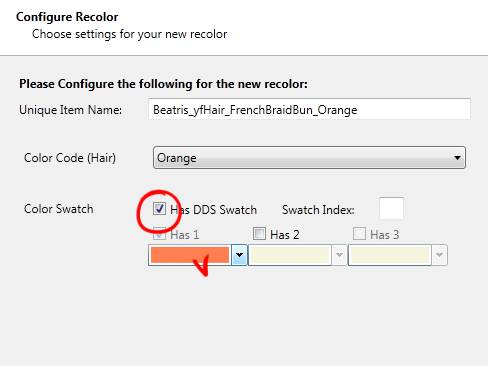 Итак, я выбираю оранжевый FrenchBraidBun (yfHair_FrenchBraidBun_Orange) и нажимаю «Next». Теперь вы можете написать название вашей прически (это необязательно). Далее ставим галочку напротив «Has DDS Swatch» и выбираем цвет из палитры. После нажимаем «Finish» и сохраняем полученный файл.