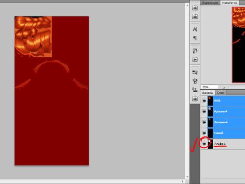 Также я хочу рассказать вам об Альфа-канале. Откройте вкладку «Каналы» и вы увидите: RGB, красный, зеленый, синий и Альфа. Нажмите на Альфа - часть текстуры будет охватываться красным цветом. Эта часть не отображается в игре. Это также будет полезно при создании одежды. Вы можете добавлять некоторые плоские детали (рукава, например), редактируя Альфа-канал. При сохранении, убедитесь, что Альфа-канал выключен!