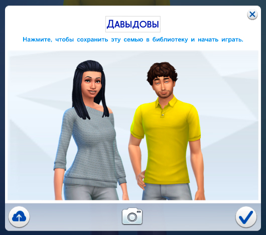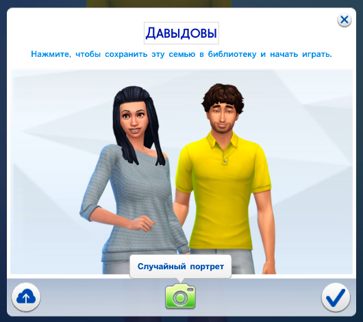 Итак, заходим в режим создания персонажа и создаем семью. После всех манипуляций над персонажами нажимаем кнопку «Играть», и у вас откроется окно с изменением названия будущего семейства, а также с кнопкой «Случайный портрет». Игра автоматически уже сгенерировала портрет семейства, но если он вам не нравится, то вы можете нажать на эту самую кнопку, и тогда игра сгенирирует новый портрет с другим ракурсом для персонажей. Вы можете нажимать на эту кнопку сколько вам угодно, пока не подберете идеальный портрет для вашей семьи: