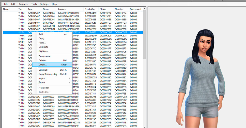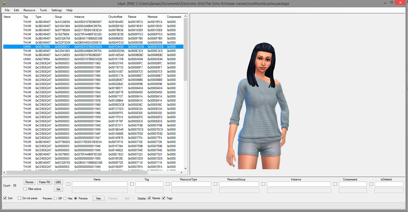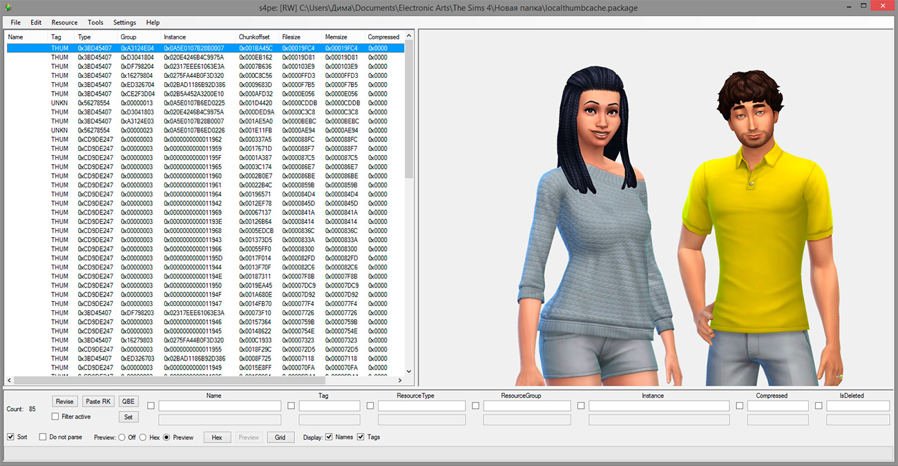 Теперь сохраняем вашу семью и идём в Мои документы\Electronic Arts\The Sims 4 (при этом закрывать игру необязательно). Копируем файл localthumbcache.package в другую папку и открываем его через S4PE. Там вы увидите список, в котором вам и предстоит найти вашу семью - это не займет много времени, так как вы увидите превью каждого файла. Вы можете экспортировать как полный портрет семьи, так и фотографию каждого её члена.