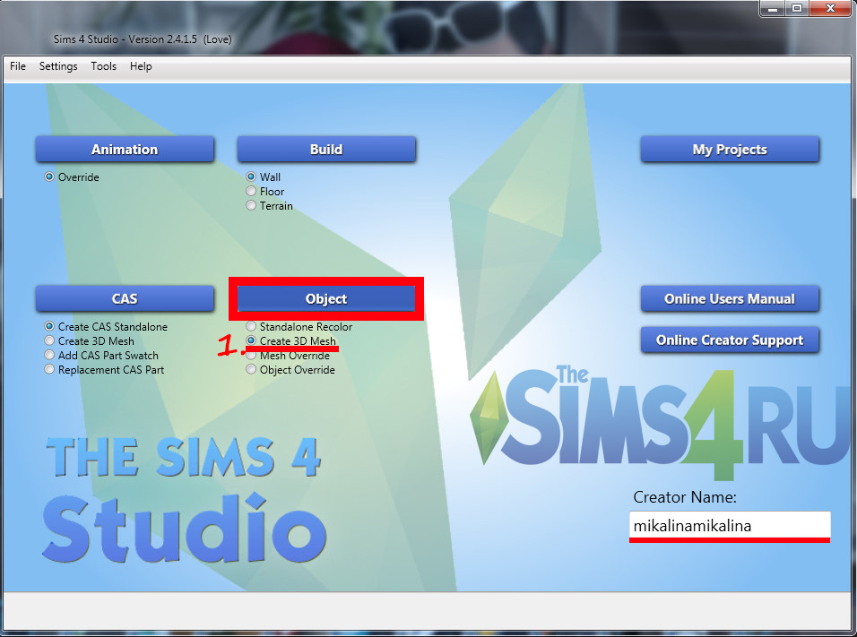 1. Открываем Студию и вводим свой ник в поле «creator name», если вы этого еще не делали ранее. Выбираем «Create 3D Mesh» и нажимаем кнопку «Object».