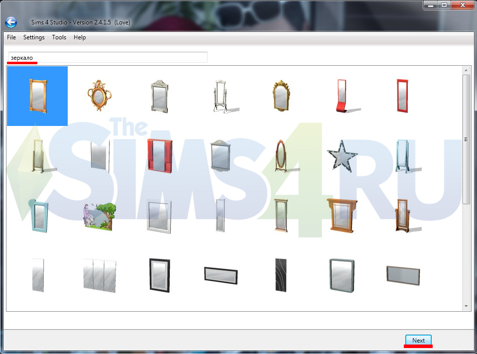 2. Выбираем из списка предмет из нужной категории. Т.е. если вы хотите создать меш стула, выбираете стул, если это какая-то декорация на стену, выбирайте картины и т.д. Так же, есть возможность не искать предметы в ручную, а просто введите в верху в поиске на русском языке название предмета. Когда определились, просто нажмите на иконку нужного предмета и нажмите кнопку «Next/Далее». Назовите свой packege по желанию и запомните куда он сохранился или сами прописывайте путь сохранения, чтобы потом не искать по всем папкам.