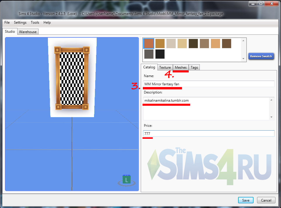 3. В поле «Name/Имя» Вводите как бы вы хотели назвать объект. Его можно вводить как на русском, так и на английском, но если вы собираетесь выкладывать где-то свое творение лучше назвать свое творение на английском, дабы не было проблем с отображением символов у пользователей использующих игру на другом языке. Так же заполняем «Description/Описание» и вписываем цену в поле «Price/Цена».