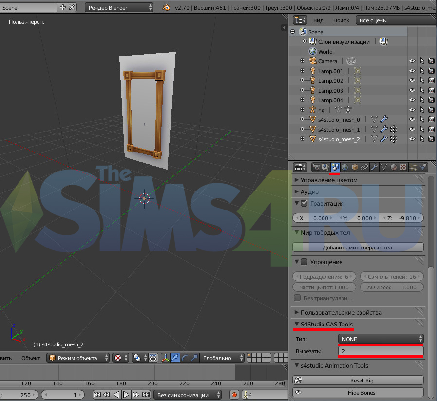 Теперь нажимаем на вкладку «Сцена»(Круг и цилиндр). Находим в самом низу раздел «S4Studio CAS Tools». В Типе/Type должно стоять значение «NONE», а в Cut/ Вырезать будет цифра.(у различных объектов она отличается) Ее мы вписываем потом в раздел «S4Studio CAS Tools» и NONE у нашего меша, на который мы хотим заменить стандартный.