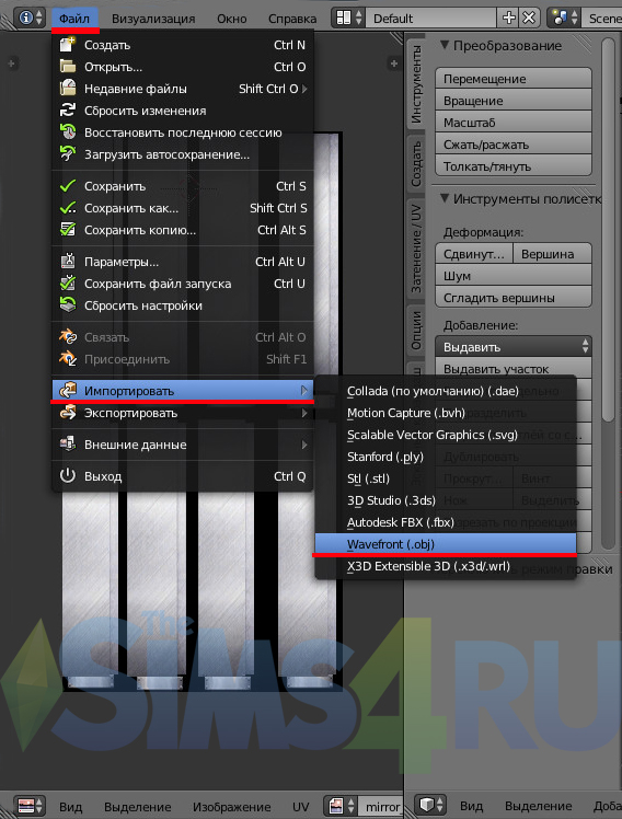 5. Заходим во вкладку Файл/File справа вверху. И выбираем Импорт/Импортировать-> «Wavefront (.obj)». Загружаем наш файл с заранее заготовленным мешем. Так же, вы можете создать прямо в Blender что-то, это избавит вас от импорта и экспорта, при условии, что творить вы начнете прямо в данном файле.