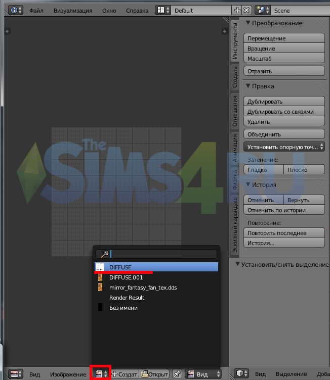 9. Щелкните на значок листа с изображением заката и выбирайте там «DIFFUSE» это «текстурка» возможных теней в игре, выделите плоскость за мешем и переместите на нужную тень из предложенных. На листе представлены тени как для стени, так и для пола.