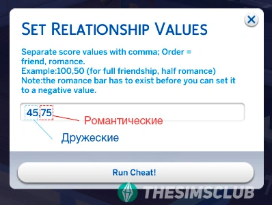 - Во вкладке "Отношения", при нажатии правой кнопкой мыши на сима, вы можете установить уровень отношений в процентах (сначала дружеских, а через запятую романтических).