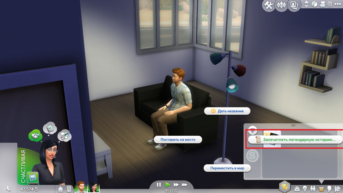 Для этого нужно кликнуть по книге и выбрать действие «Запечатлеть легендарную историю (имя сима)» и выбрать дорогого вам сима.