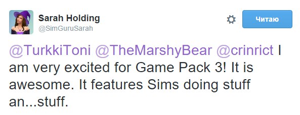 SimGuruSarah в своем твиттере подтвердила, что идет работа над третьим игровым набором для The Sims 4, а также добавила, что [в нем] "симы будут делать разные вещи... с вещами" - что бы это ни значило.